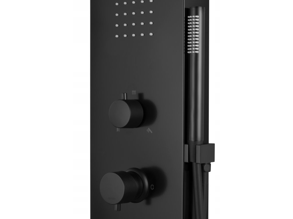 Czarny panel prysznicowy Corsan Festo posiada trzy opcje natryskowe, które przełączane są za pomocą górnego pokrętła funkcyjnego. Panel umożliwia korzystanie z jednej funkcji w jednym czasie. Opcje natryskowe do wyboru to deszczownica, prysznic ręczny i hydromasaż. Obecność technologii Corsan Anit Calc w dyszach natryskowych zapobiega powstawaniu nadmiernego osadu z kamienia. Natomiast wydajny hydromasaż daje możliwość skorzystania z wyjątkowej chwili relaksu pod prysznicem.
