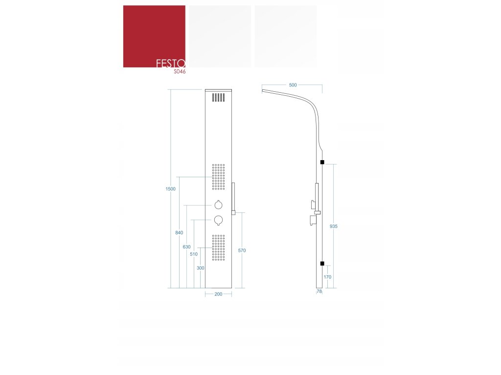 Festo S-046 to panel prysznicowy bez termostatu. Standardowa bateria mieszaczowa odpowiedzialna jest za regulację ciśnienia oraz temperatury przepływającej wody. Ciepła i zimna woda wpływa do głowicy mieszaczowej a następnie jest kierowana do wybranej funkcji takiej jak np. deszczownica, słuchawka prysznicowa lub hydromasaż. Ciśnienie i temperaturę wody reguluje się dolnym pokrętłem.