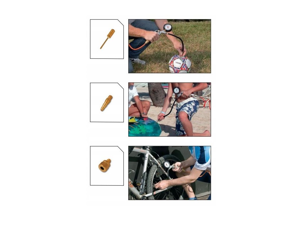 W skład zestawu wchodzą 3 końcówki, które są pomocne m. in. w pompowaniu piłek, pontonów, kół samochodowych, zabawek, materaców.