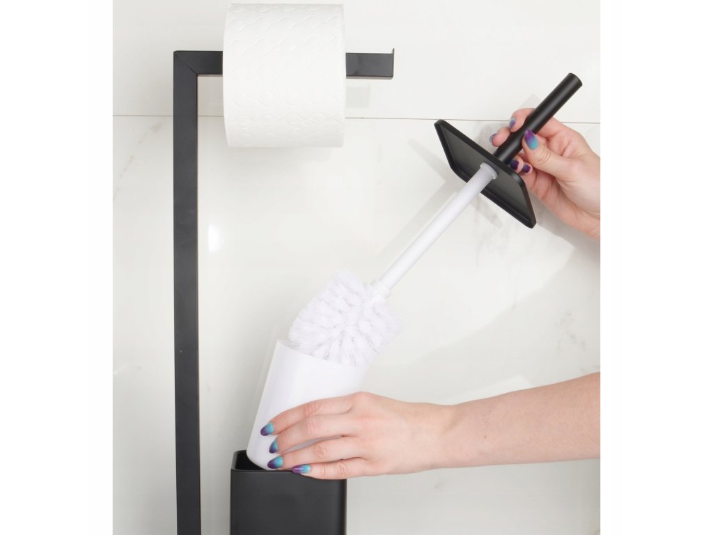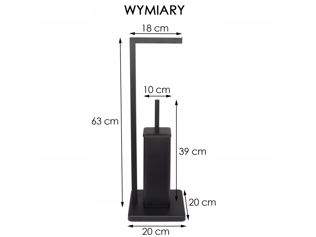 Praktyczny stojak do WC 2w1 ze szczotką toaletową oraz uchwytem na papier toaletowy. Stojak wykonany został z wysokiej jakości stali malowanej proszkowo na kolor czarny (matowy). Wewnątrz pojemnika na szczotkę znajduje się osłonka / mniejszy wyjmowalny pojemnik na ociekającą wodę, dzięki czemu zewnętrzny pojemnik na szczotkę jest suchy i czysty w środku. Podstawa jest soldina i gruba, o kwadratowym kształcie, posiadająca od spodu podkładkę zapobiegającą przed zarysowaniem podłogi oraz ślizganiem się stojaka po niej. Stabilny stelażumożliwia łatwe przenoszenie stojaka w dogodne miejsce.