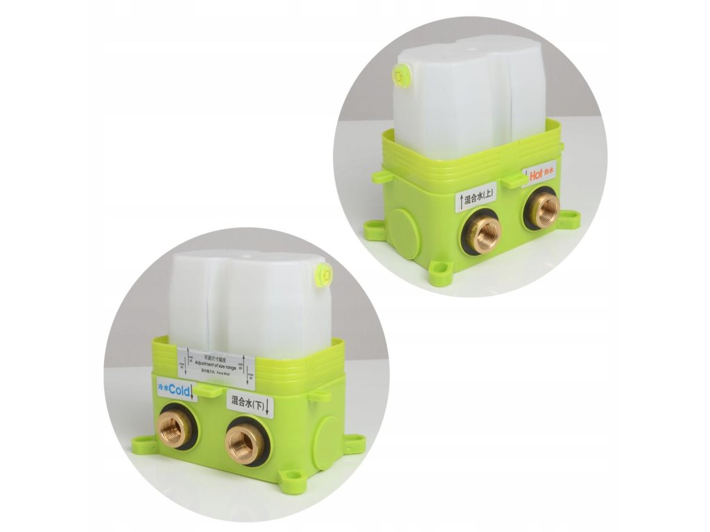 Súprava obsahuje BOX MONTÁŽ , ktorý umožňuje rýchlo a presne namontovať batériu v stene (použitie podobné systémy všetkých popredných výrobcov, ako sú. Hansgrohe). To je veľmi dôležité pre dokonalé adhézie externej skupiny dlaždice glazúry (bez montážny rámček je veľmi ťažké stanoviť batérie ukryté v rovine steny a vonkajšieho povrchu panelu v jednom z rohov majú tendenciu byť viac vystupovať zo steny) , I-BOX je vyrobená z plastu a mosadze vnútorné súčasti, ktorá zaručuje nierdzewność, vysokú kvalitu a spoľahlivosť. Systém umožňuje ľahký prístup k vnútorným súčastiam batérie pre údržbu.