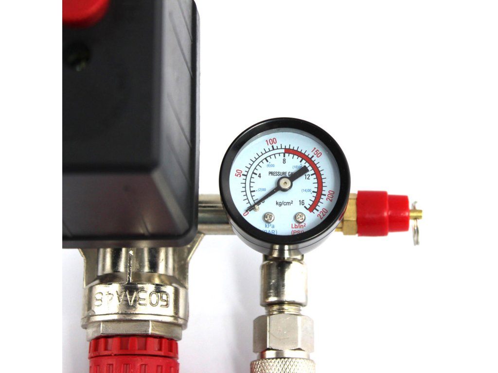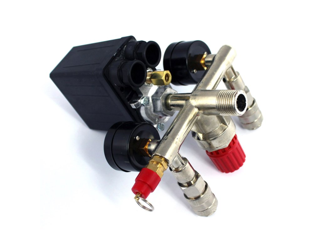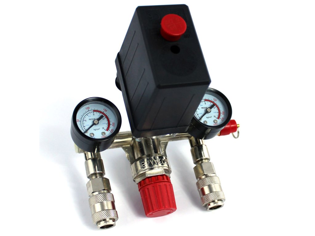 Wysokiej jakości wyłącznik ciśnieniowy (presostat) z kolektorem, dwoma szybkozłączkami i manometrami przeznaczony do kompresorów ciśnieniowych na 230V. Presostat wykorzystywany jest głównie w kompresorach o pojemności 24l, 50l, 60l, 100l, 150l