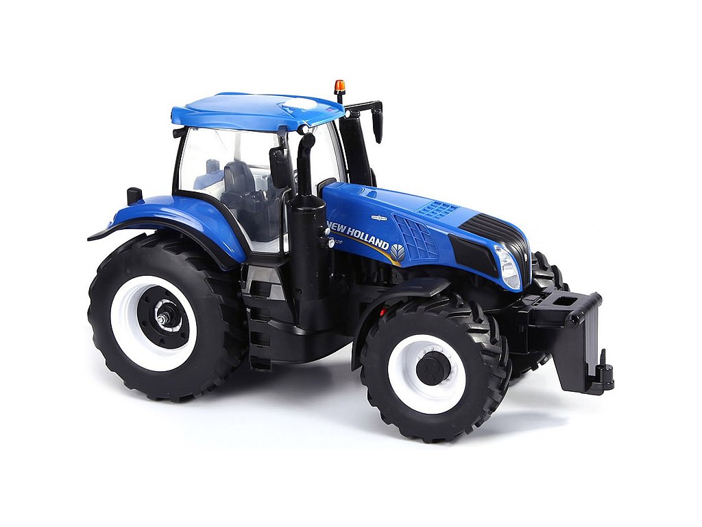Zdalnie sterowany traktor na licencji New Holland. Traktor posiada duże pompowane opony z bieżnikiem oraz światła ledowe.