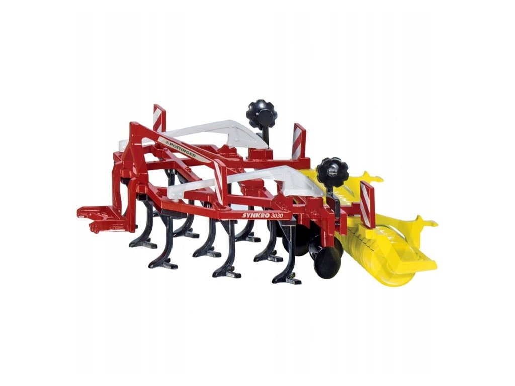 Popis: Model Synkro od tradičnej rakúskej firmy Pöttinger je jedným z najmodernejších kultivačných zariadení na trhu. Pôvodne 3 metre široký kultivátor s kovovým rámom je vybavený okrem hrotov aj otočným kultivačným valcom. Model, ktorý je lakovaný v živých farbách, je možné jednoducho pripevniť na traktory SIKU v mierke 1:32.
