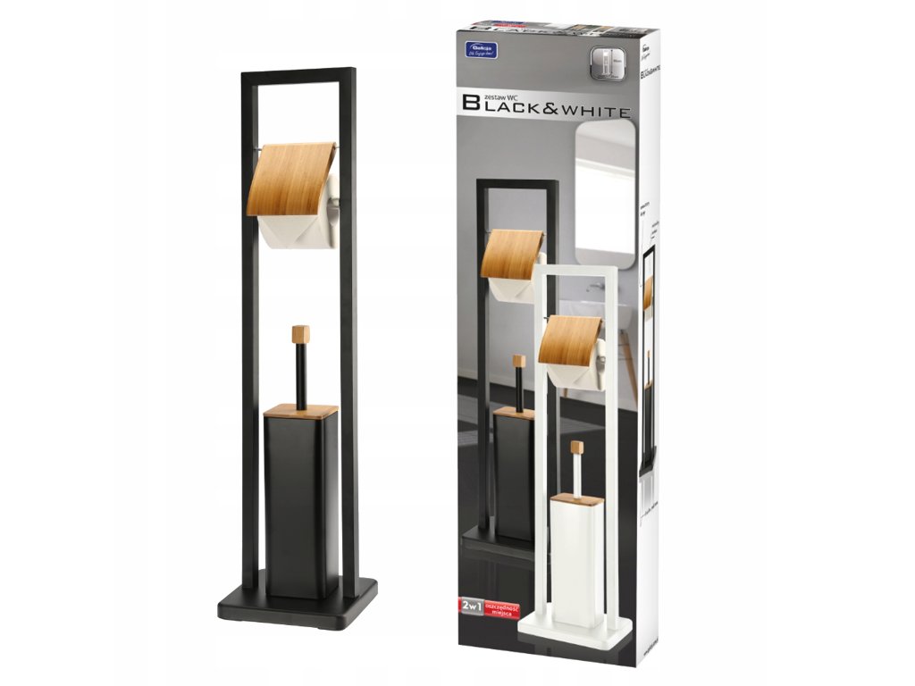 Wolnostojący stojak ze szczotką WC oraz z zintegrowanym uchwytem na papier toaletowy.