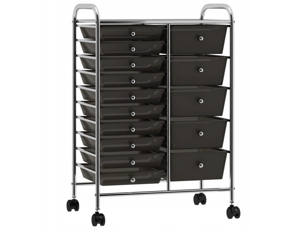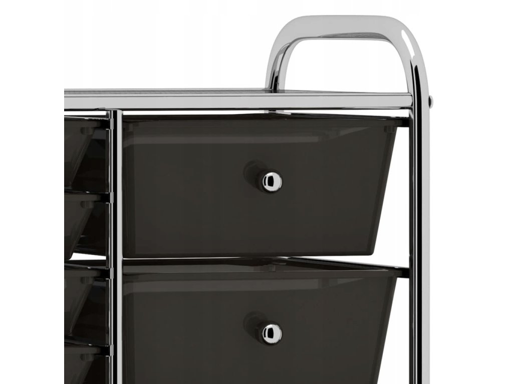 Chromowana rama zapewnia solidne i trwałe podparcie dla ciężaru, a 15 wyjmowanych, przestronnych koszy pozwala na swobodne przechowywanie przedmiotów. Szuflady łatwo się wyjmuje i czyści. Ponadto wózek wyposażono w 4 skrętne kółka, które ułatwiają transport oraz przechowywanie.