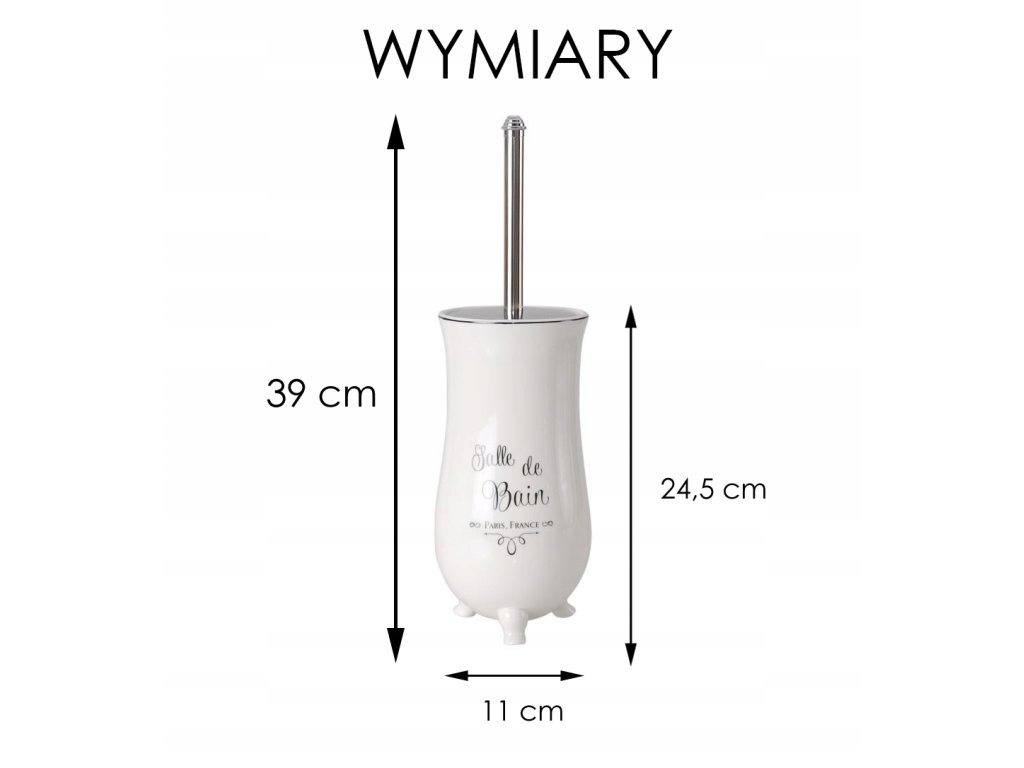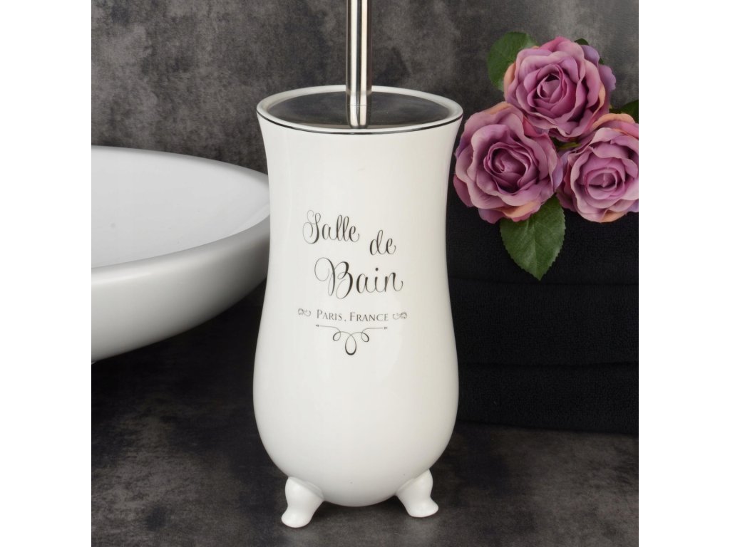 Unikatowa szczotka toaletowa z pojemnikiem w kolorze delikatnie złamanej bieli, wykonanym z wysokiej jakości szkliwionej porcelany. Jest to element serii Salle de Bain marki Yoka Home z kolekcji Premium. Praktyczna i łatwa do utrzymania w czystości. Posiada na przedniej części czarny napis "Salle de Bain PARIS, FRANCE". Idealnie komponuje się z wystrojem łazienki w ponadczasowym stylu retro lub w aranżacji francuskiej.