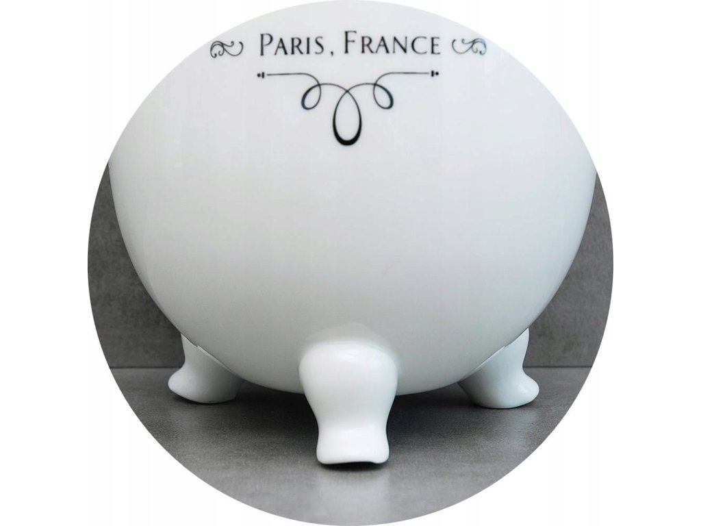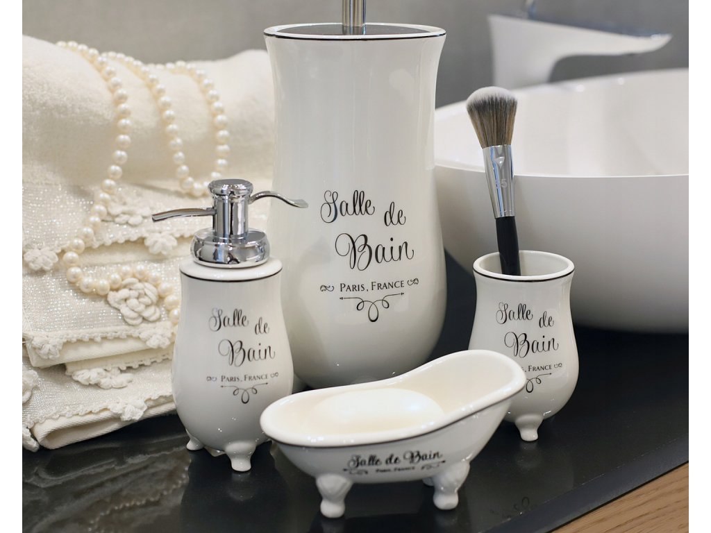 • Na przedniej części pojemnika znajduje się czarny napis "Salle de Bain - PARIS, FRANCE" z dekoracyjnymi elementami