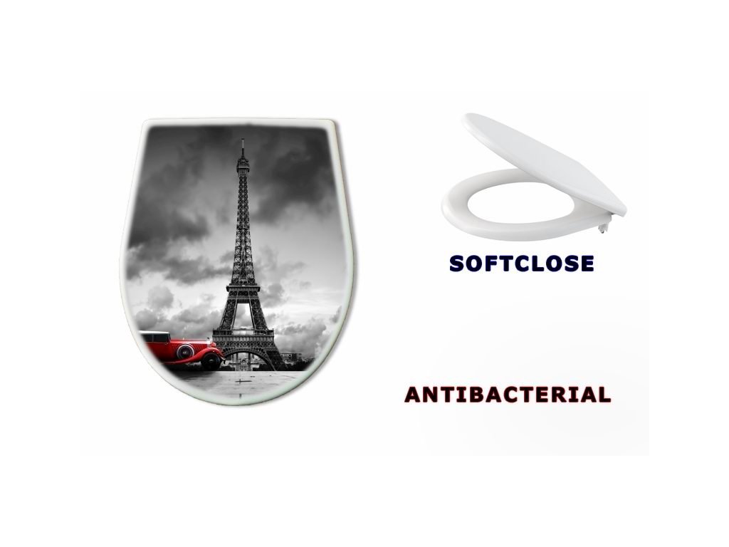 s WC sedátko pomalým DUROPLAST 76327230 - Effel TOWER PARIS FRANCE a červené retro auto BLACK AND WHITE