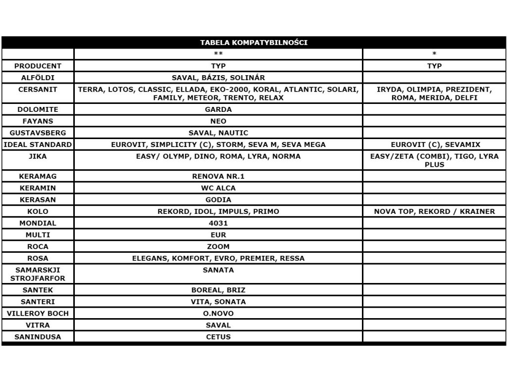 Tabela kompatybilności: Alfoldi Saval, Bazis, Solinar, Cersanit Terra, Lotos, Classic, Ellada, Eko-2000, Koral, Atlantic, Solari, Family, Meteor, Trento, Relax Iryda, Olimpia, Prezident, Roma, Merida, Delfi, Dolomite, Garda, Fayans Neo, Gustavsberg, Saval, Nautic, Ideal Standard Eurovit, Simplicity (C), Storm, Seva M, Seva Mega, EurovitSevaMixJika Easy/ Olymp, Dino, Roma, Lyra, Norma, EasyZeta (combi), Tigo, Lyra Plus, Keramag Renova Nr.1, Keramin WC Alca, Kerasan Godia, KOLO, Rekord, Idol, Impuls, Primo, Nova Top, Rekord Krainer, Mondial 4031, Multi Eur, ROCA Zoom, Rosa Elegans, Komfort, Evro, Premier, Ressa, Samarskji Strojfarfor Sanata, Santek Boreal, Briz,Santeri Vita, Sonata, Villeroy Boch O.novo, Vitra Saval, Sanindusa, Cetus