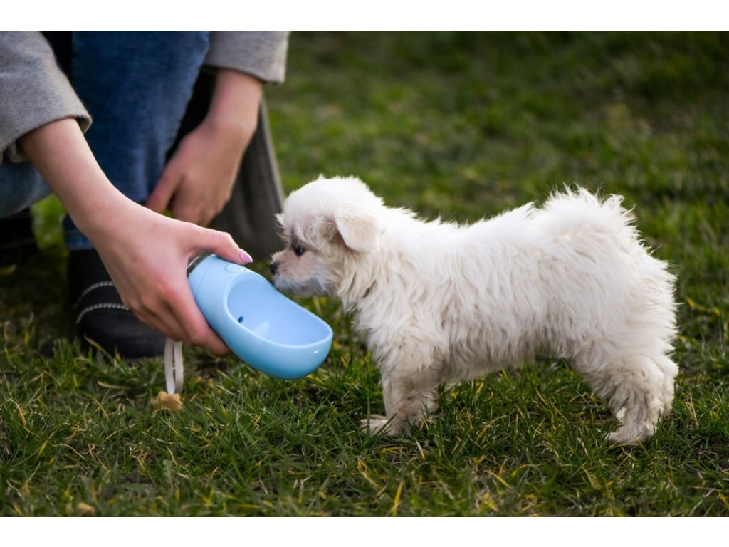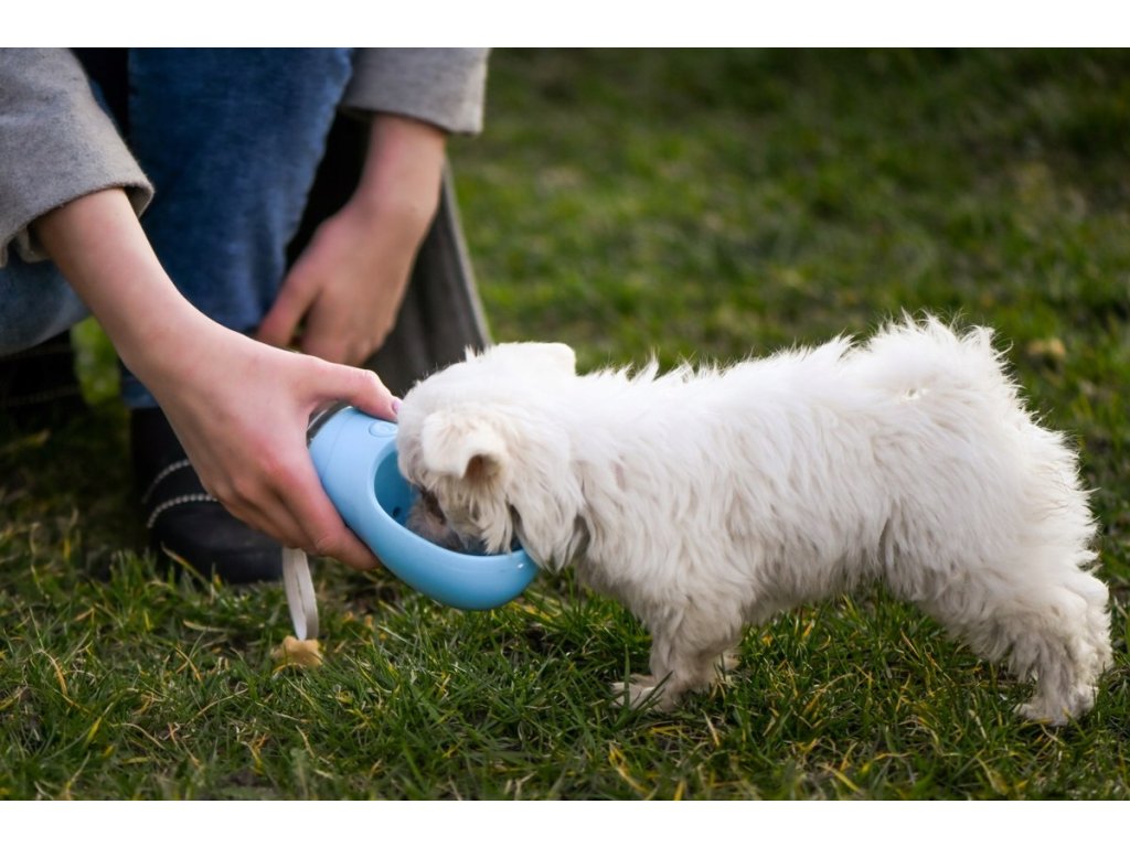 Praktyczna butelka na wodę dla psa, wyposażona w miseczkę.