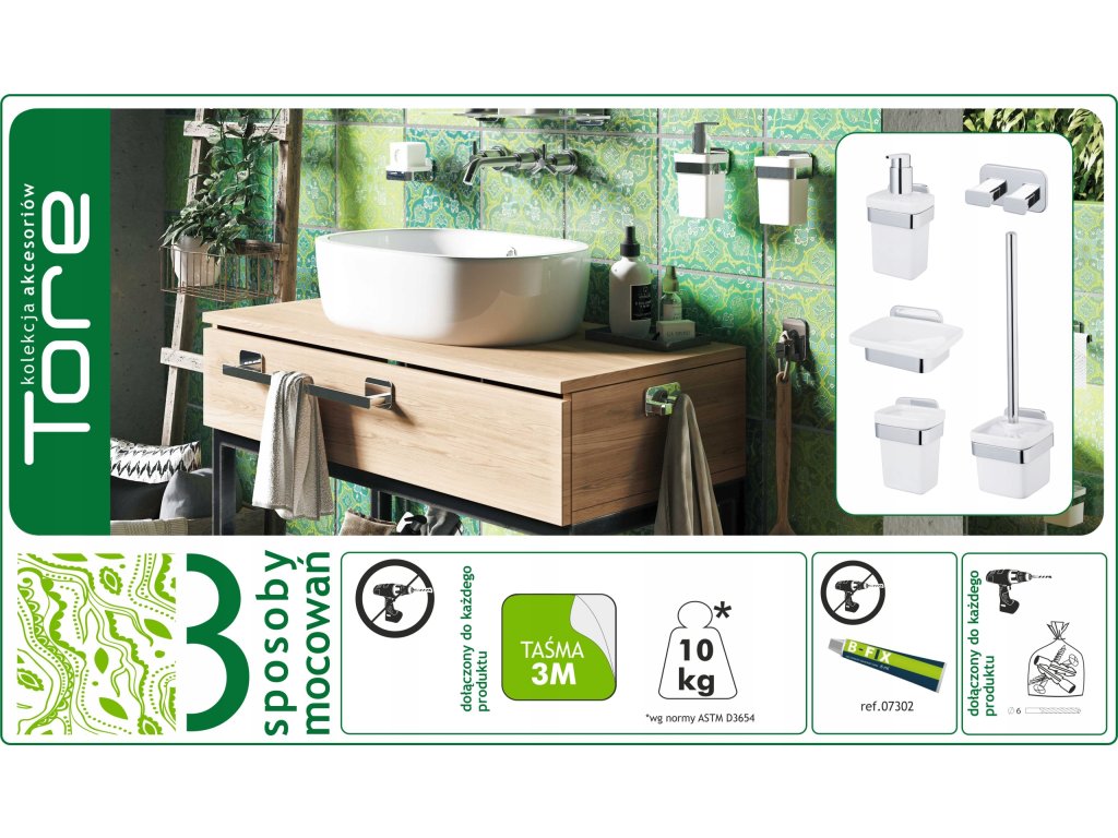 Produkt mocowany do ściany za pomocą śrub (w zestawie), taśmy 3M (w zestawie) lub kleju.