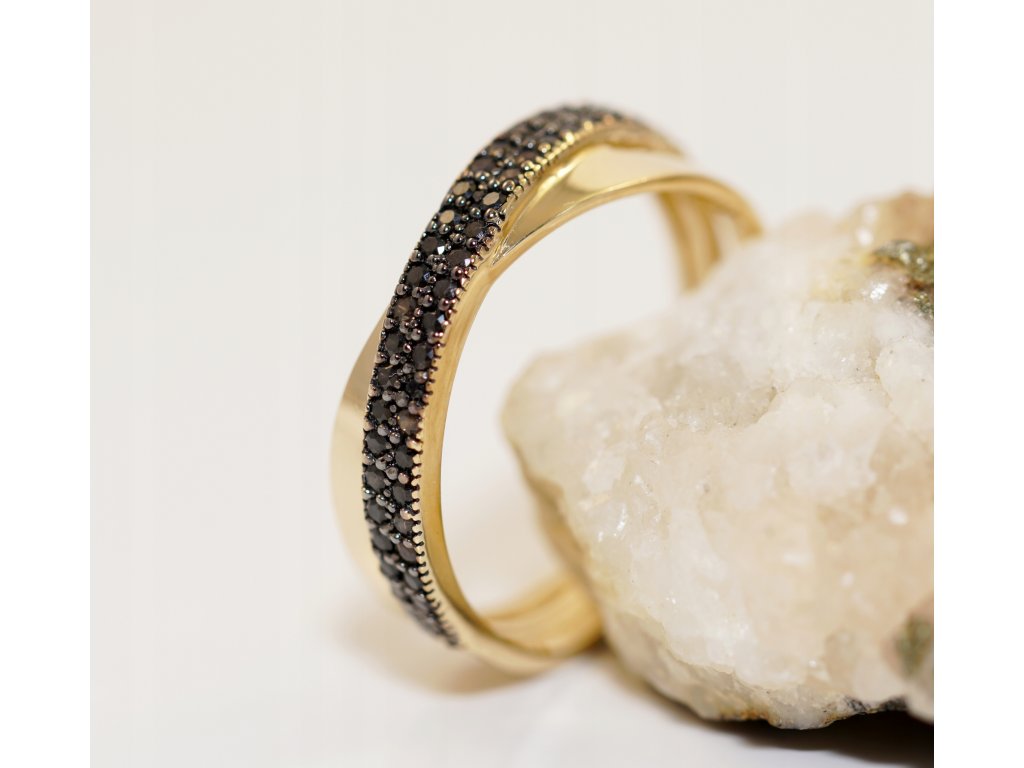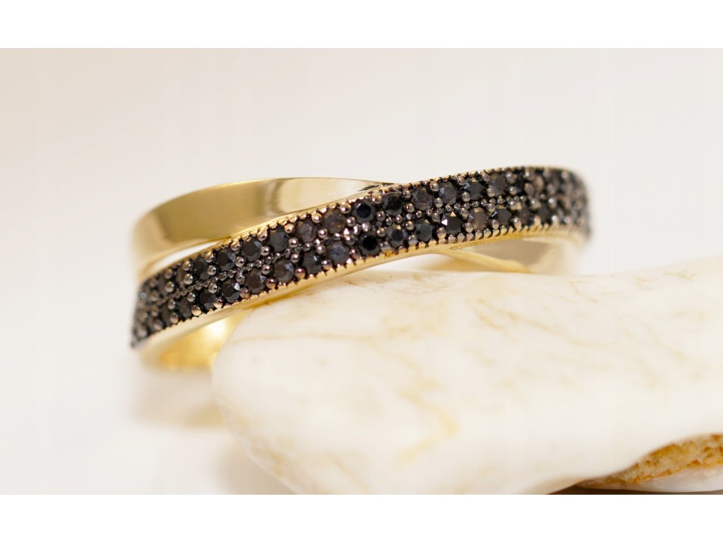 Mamy przyjemność zaprezentować bardzo ładny pierścionek, wykonany z żółtego złota próby 0,585. Zdobią go 54 czarne cyrkonie umieszczone w dwóch rzędach na mijających się paskach.