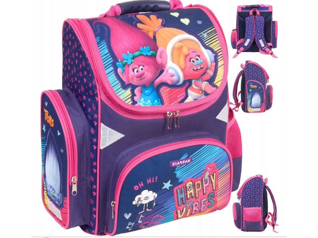 Jednokomorowy tornister firmy Starpak typu hardbag z grafiką ulubionych bohaterów Trolls. Wyposażony w system ergonomicznych pleców i ramion pokrytych gąbką zapewniającą swobodny przepływ powietrza i komfort użytkowania. Posiada wewnętrzny organizer, który ułatwia utrzymanie porządku i dodatkowo został wyposażony w obszerną, przednią kieszeń na zamek i dwie mniejsze kieszenie boczne, z których jedna zapinana jest na zamek, a druga wykonana z siateczki jest idealna na bidon lub butelkę z napojem. Usztywniany, pokryty gumą dół zabezpiecza przed brudem i wilgocią. Tornister posiada elementy odblaskowe zapewniające bezpieczeństwo dziecku. Jego waga wynosi zaledwie 1,15 kg.
