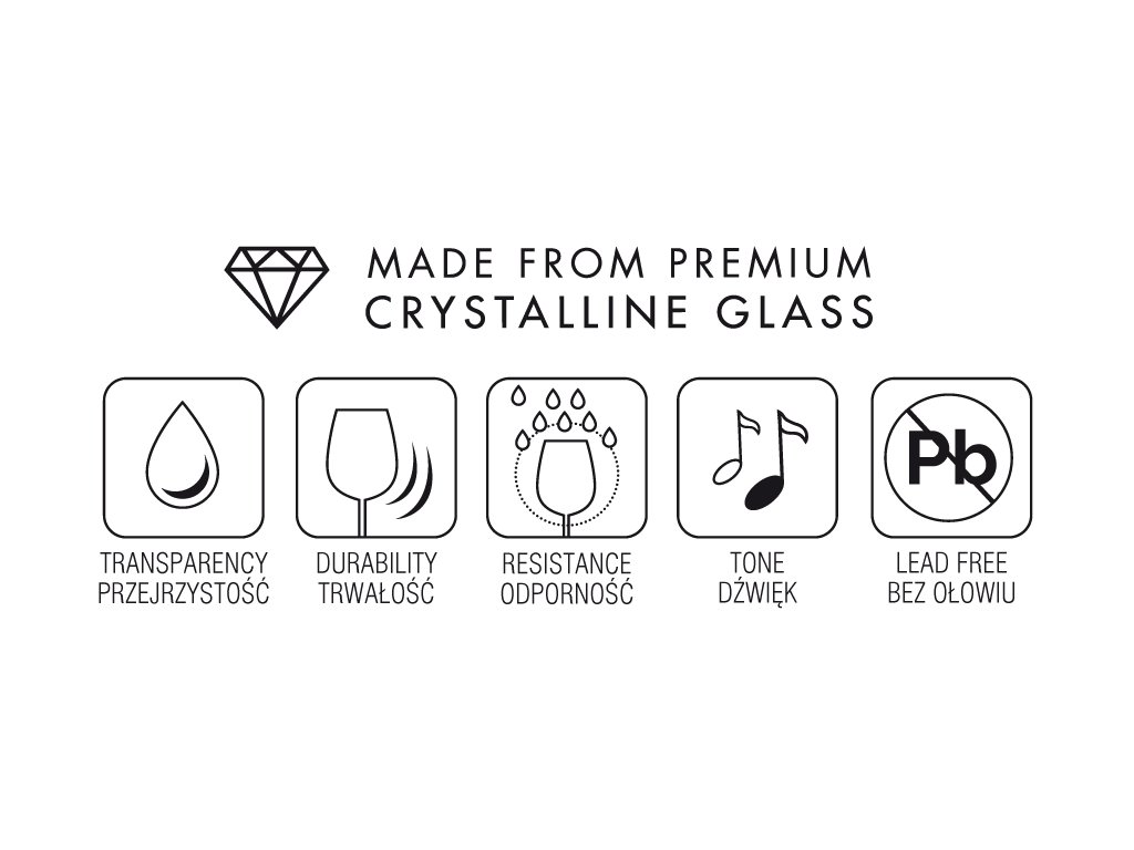 Kieliszki wyprodukowane zostały z najwyższej jakości szkła Crystalline. Charakteryzuje się ono doskonałą przejrzystością oraz wyjątkową wytrzymałością i trwałością, także jeśli chodzi o odporność na matowienie powodowane myciem w zmywarkach.