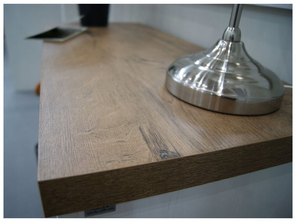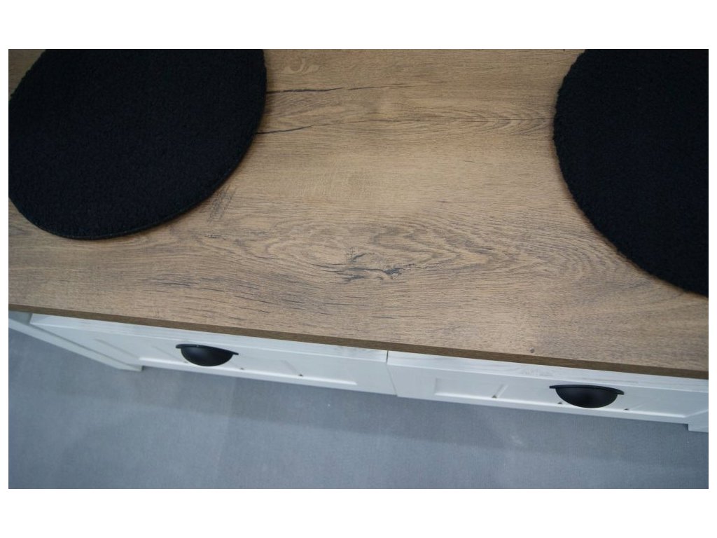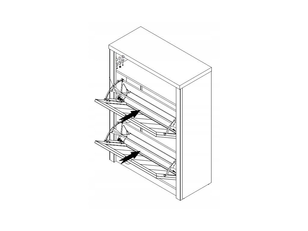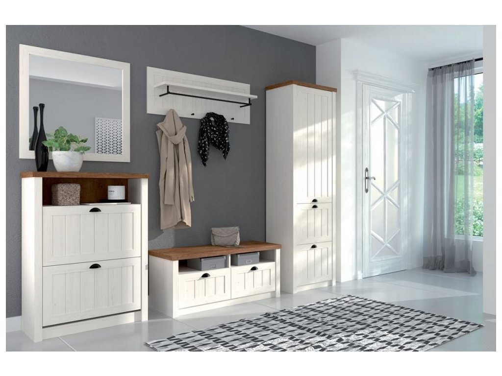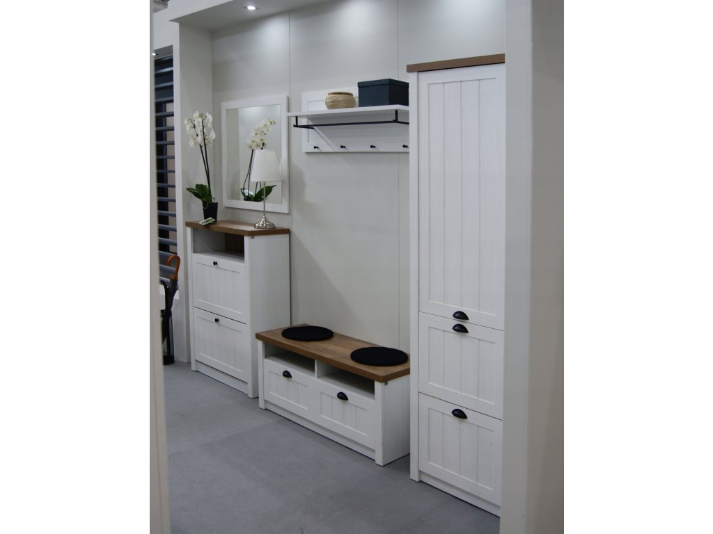Wyposażona w dwie szafki z uchylną klapą i przegrodami- miejscem przeznaczonym na obuwie oraz wnękę. Wykonana została z imitacji bielonego drewna w odcieniu sosny andersen w połączeniu z dębem lefkas. Fronty szafki posiadają charakterystyczne listewki, a całość dopełniają metalowe uchwyty w czarnym kolorze.