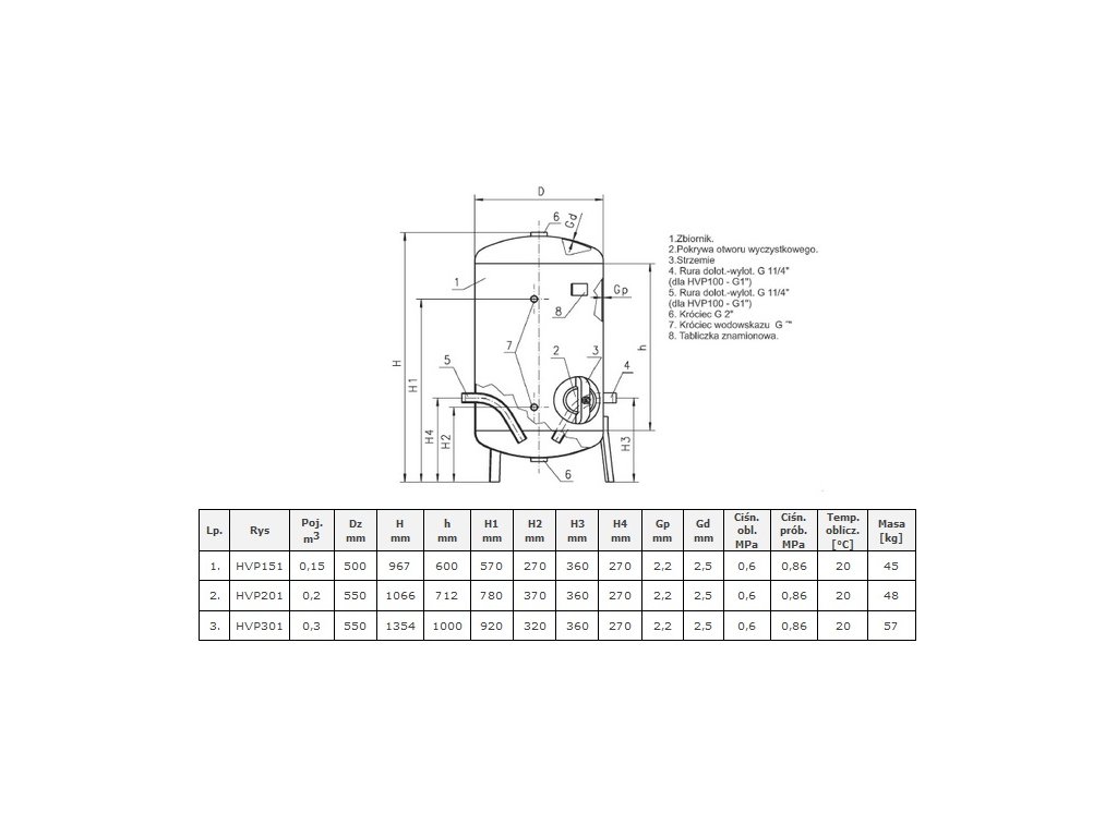 Zbiornik ciśnieniowy typu HVP wykonany jest z blachy stalowej niskowęglowej w całości spawanej o pojemnościach 100, 150, 200, 300, 500, 1000 i 1500 litrów. Automaty wodociągowe ze zbiornikiem hydroforowym mogą być podłączone tylko do bezciśnieniowego ujęcia wody. Zbiornik można instalować tylko do układów, w których max. ciśnienie nie przekroczy ciśnienia obliczeniowego danego typu zbiornika. Wewnątrz pokryty jest on powłoką ochronną cynkową. Pionowy układ zbiornika zapewniają 3 nogi przyspawane na obwodzie zbiornika. W części walcowej utwierdzona jest w złączkach kolanowych rurka wodowskazu, określająca poziom wody w zbiorniku. Otwór wyczystkowy znajduje się w płaszczu zbiornika. W górnej części zbiornika znajduje się otwór G2 zaślepiony kołkiem gwintowym, w którym osadzono manometr oraz wentyl.