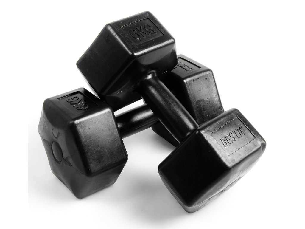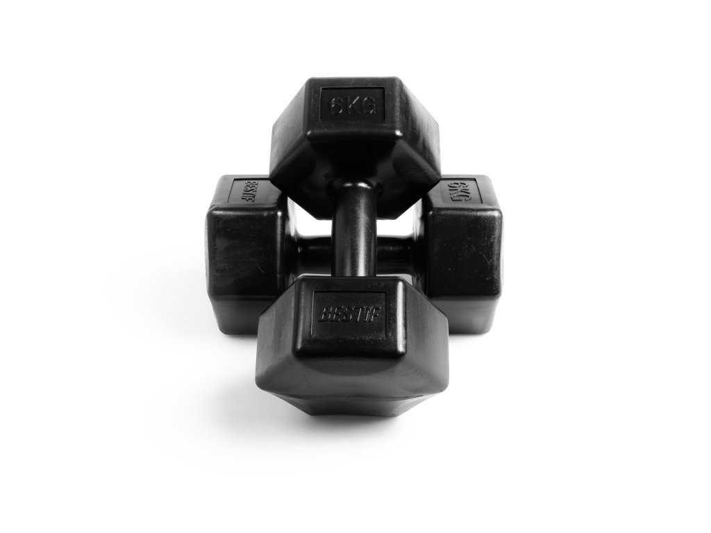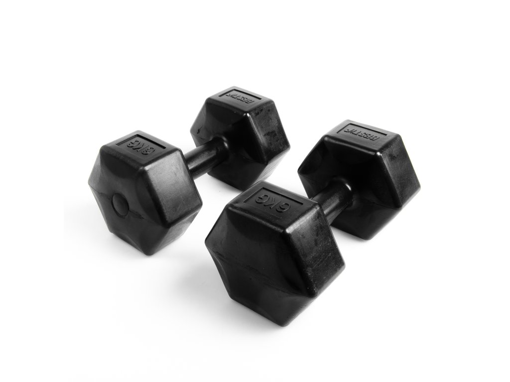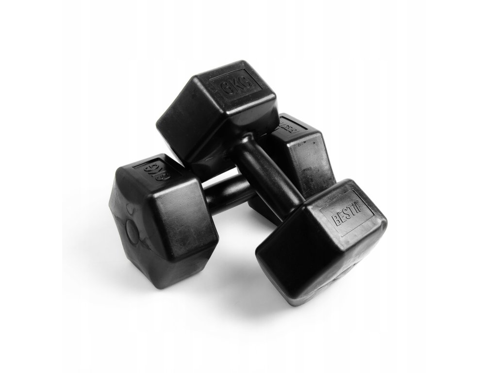 Ergonomiczny sześciokątny kształt zapobiega toczeniu się hantelek po podłożu a także pozwala na używania ich jako podpórek do pompek.
