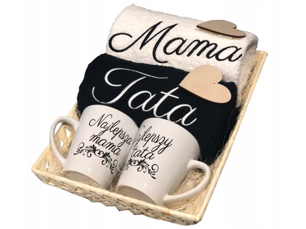 KOMPLET RĘCZNIKÓW W BAMBUSOWYM KOSZU, RĘCZNIKI O ROZMIARZE 50X100 CM - wraz z haftem Mama/Tata i w dodatkowym zestawieniu z eleganckimi kubkami LATTE z nadrukiem.