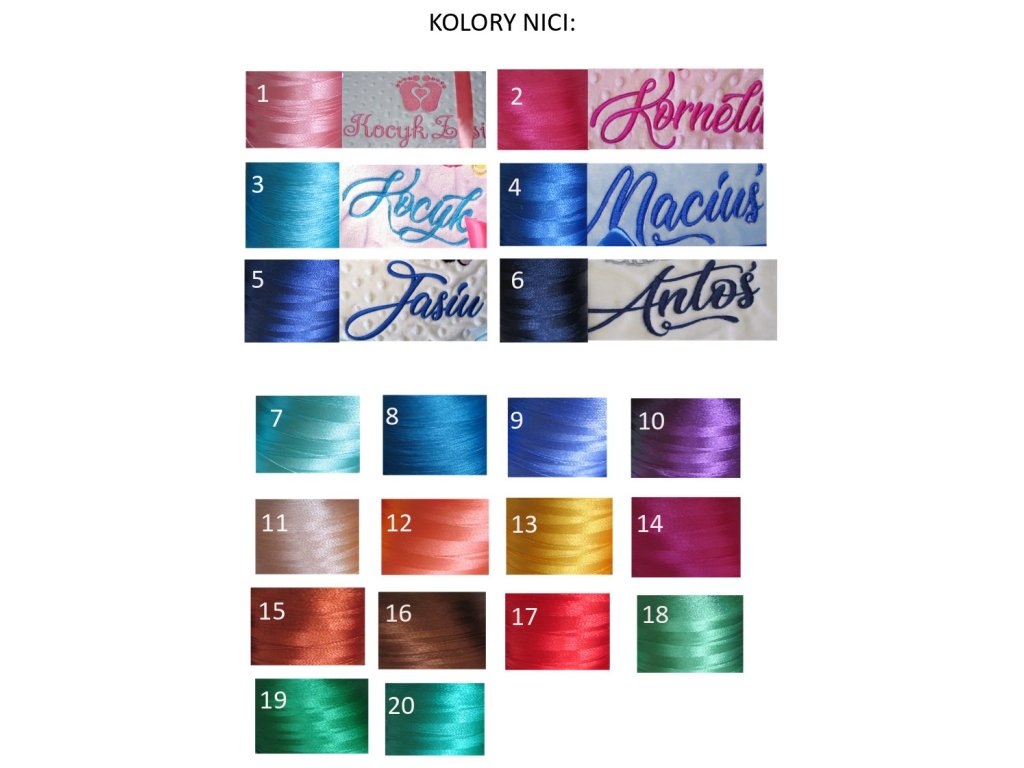 Wystarczy, że wybierzesz imię (możesz dołączyć do niego obrazek i datę urodzenia) .Wyhaftujemy go dla ciebie najlepszej jakości nićmi Madeira.