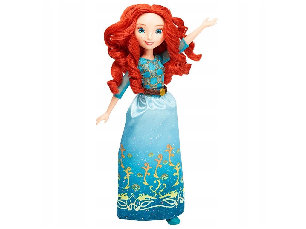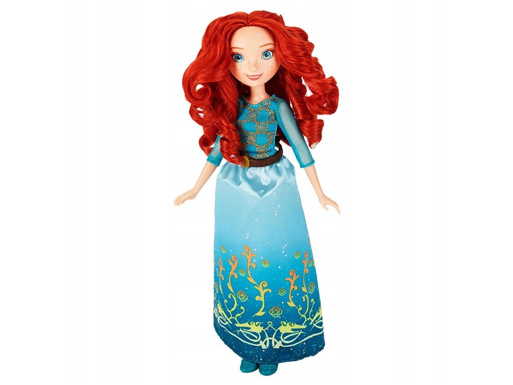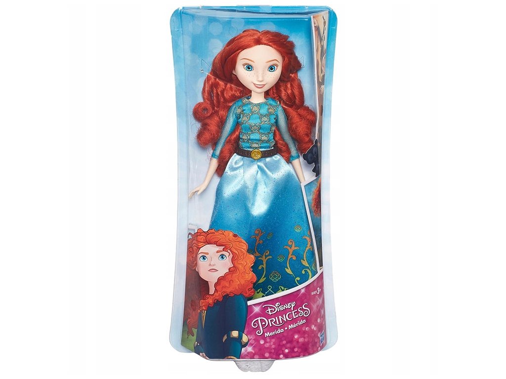 Opakowanie zawiera lalkę Meridę w niebieskiej sukni z brokatowym nadrukiem. Sukienkę zdobi brązowy pas a księżniczka ma na nogach niebieskie pantofelki.