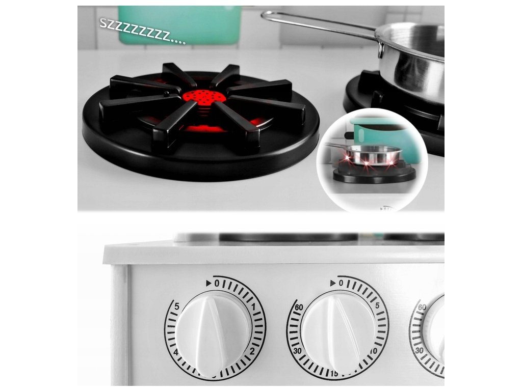 • Dzieci uwielbiają zabawy, podczas których mogą naśladować dorosłych. Ten zestaw umożliwia dzieciom odgrywanie ról dorosłych jak w prawdziwej kuchni. Palniki w piecyku świecą się i wydają dźwięki gotowania. Pokrętła podczas przekręcania pstrykają.