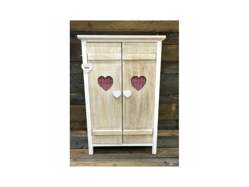 Szafka drewniana, z dwoma ozdobnymi materiałowymi serduszkami.