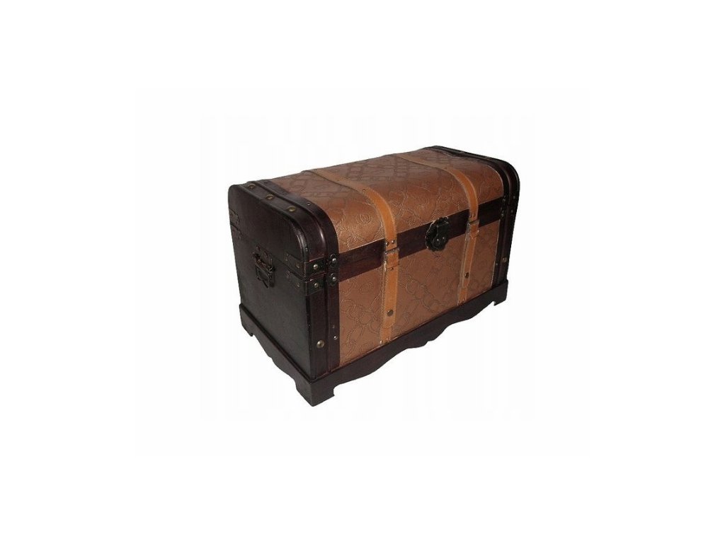 Originálna, rustikálny kufor, zámerne starý dojem (zmena farby, malé škrabance, praskliny, kovové prvky mierne pokryté hrdzou), aby vyzerali ako z predchádzajúcej éry. Vyrobené z zafarbenej preglejky, ozdobené kovovými nity a doskami. Kufor je uzatvorený dekoratívnou kovovou sponou, na veku je eko kožená rukoväť.