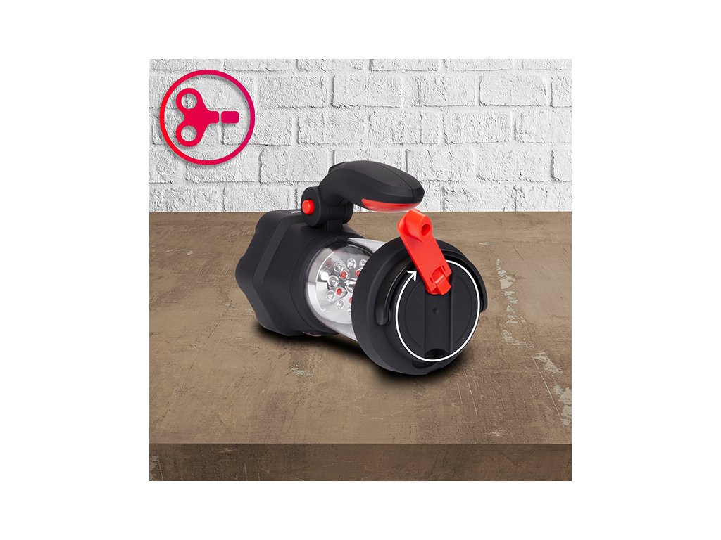 • Lampa może być ładowana w różnorodny sposób. Ładowana jest przez akumulator dynamo, lub poprzez kabel USB (dołączony w zestawie). Po jednej minucie ładowania w trybie dynamo uzyskasz 15 min pracy w trybie latarni, 6 min pracy w trybie latarki lub 120 min w trybie SOS. Przy pełnym naładowaniu baterii przewidywany czas pracy urządzenia to 5,5 godz (latarka), 2, 25 godz (latarnia), 30 godz (lampa SOS).
