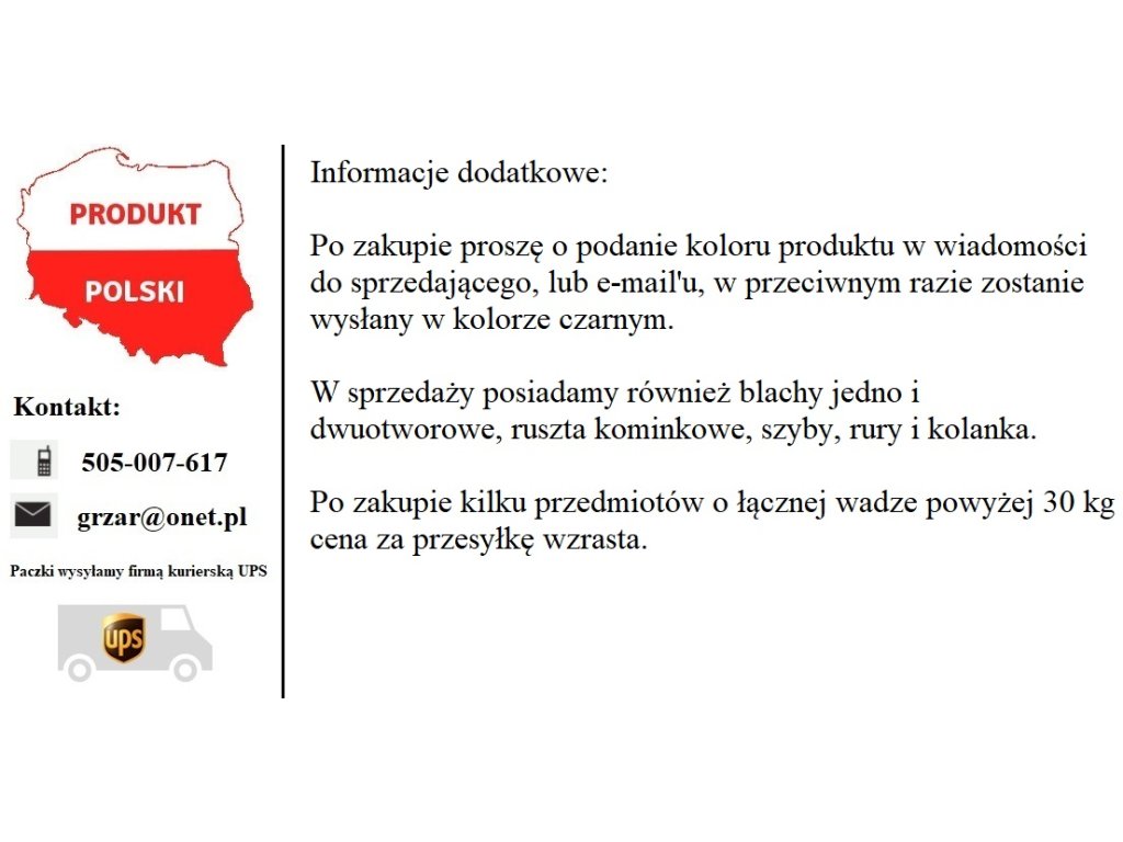 Witam Państwa. Mam do zaoferowania żeliwne drzwiczki retro z ramką półokrągłą wraz z otworami do montażu. Drzwiczki mają zastosowanie do wędzarni, pieca chlebowego itp, z wysokiej jakości żeliwa szarego.Odlewy obrabiane i malowane są w mojej firmie indywidualnie pod klienta, co świadczy o dokładności ich wykonania.Na życzenie klienta montujemy termometry na temperaturę 350 stopni nadające się do wędzarni,pieców chlebowych itp.