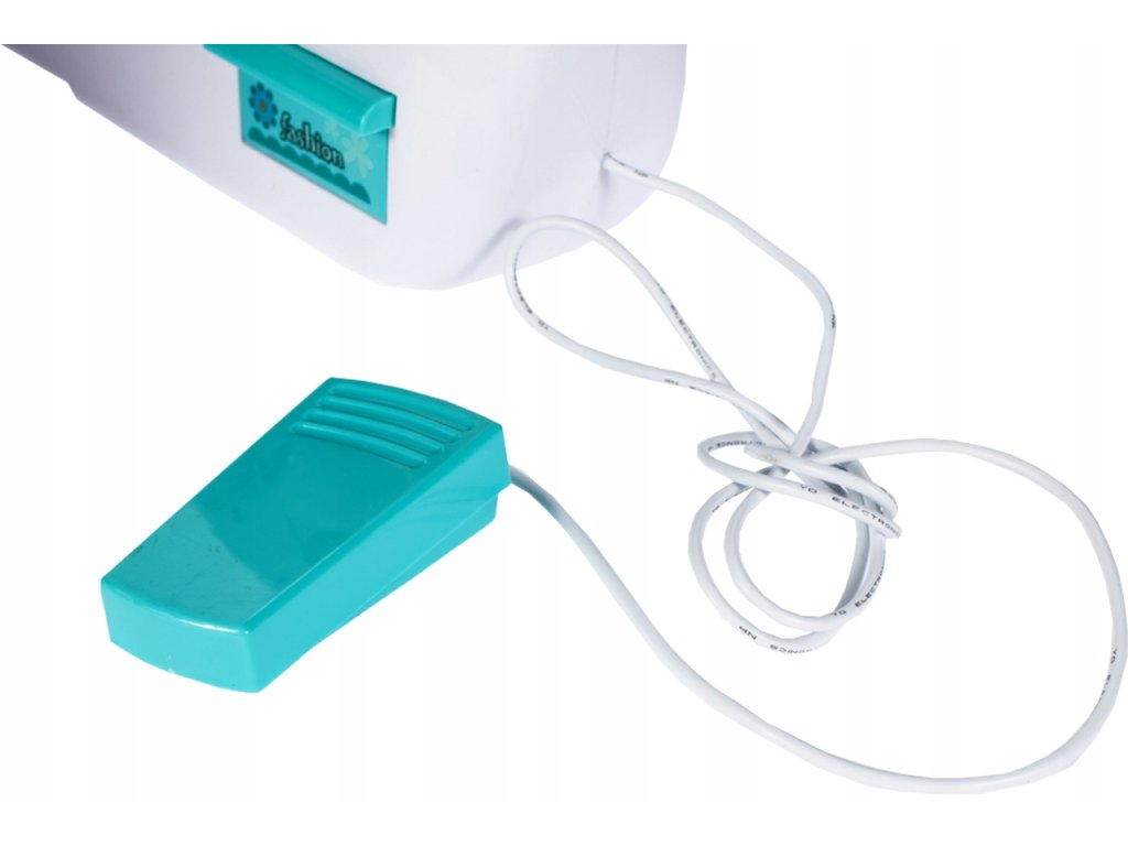 Na długim przewodzie (115cm) umieszczony jest pedał za pomocą którego sterujemy maszyną. Młoda krwacowa może wygodnie włączać i wyłączać maszynę nie odrywając obu rąk od materiału.
