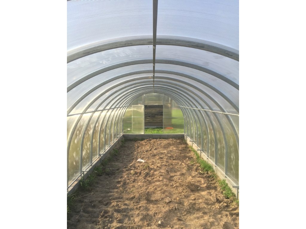 Nowoczesna i łatwa w montażu konstrukcja wykonana ze stali ocynkowanej 0,8 mm, profile zamknięte 20x20 mm, rozstaw między łukami 0,67 m. Poszycie wykonane jest z poliwęglanu komorowego odpornego na promieniowanie UV i gradobicie. Półokrągły kształt szklarni zapobiega zaleganiu śniegu.