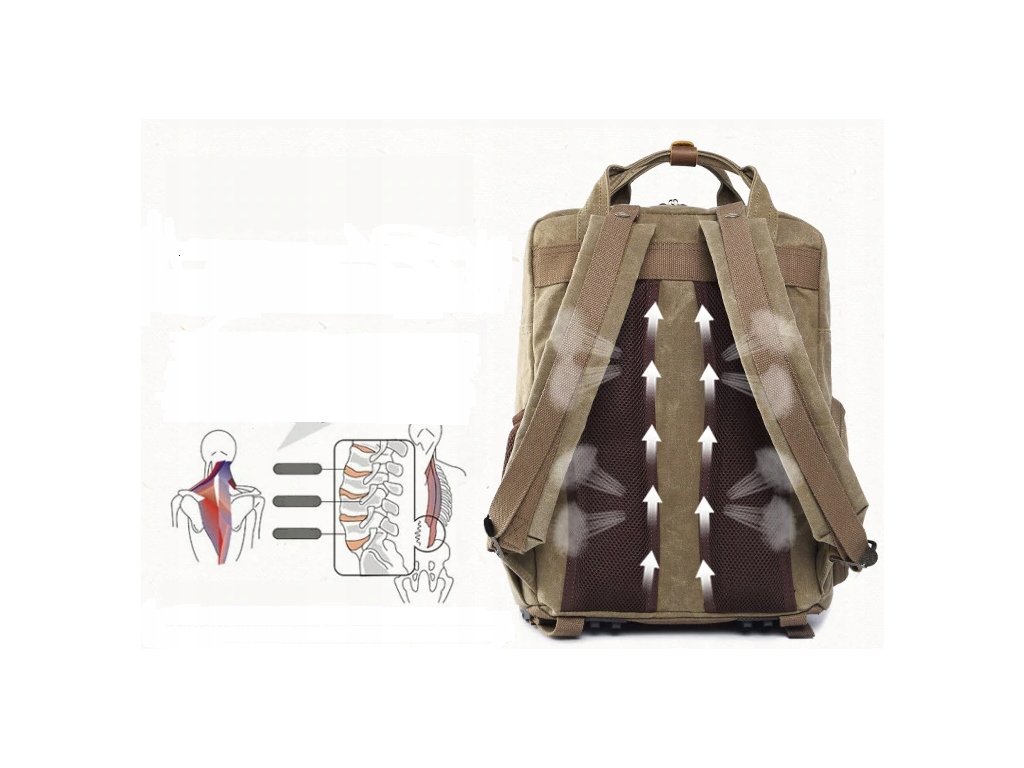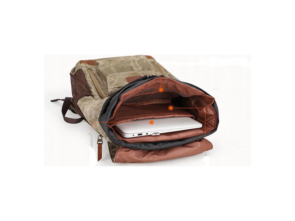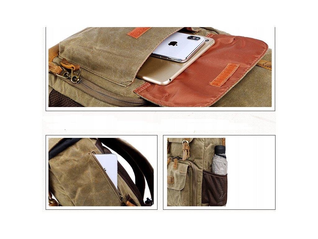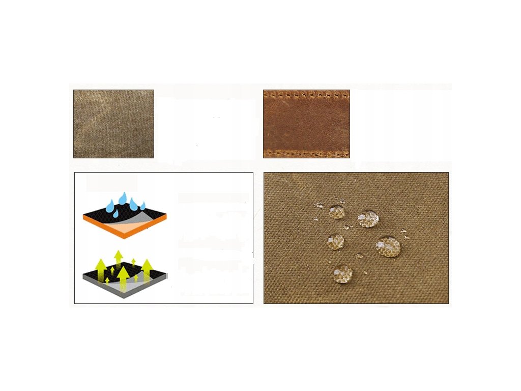 Plecak wykonany z tkaniny odpornej na przemakanie. Płótno zostało pokryte specjalną olejowaną powierzchnią, która odporna jest na warunki atmosferyczne, ale mimo to także oddycha.