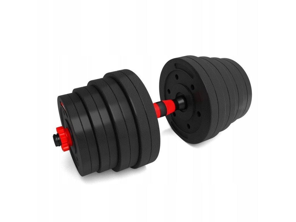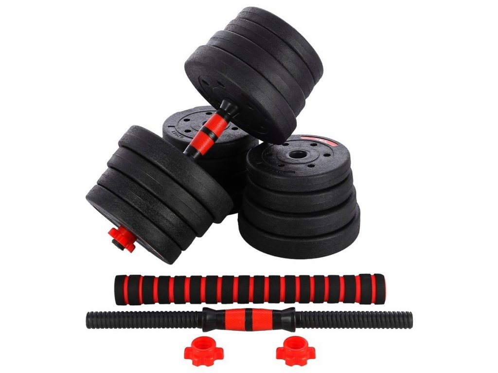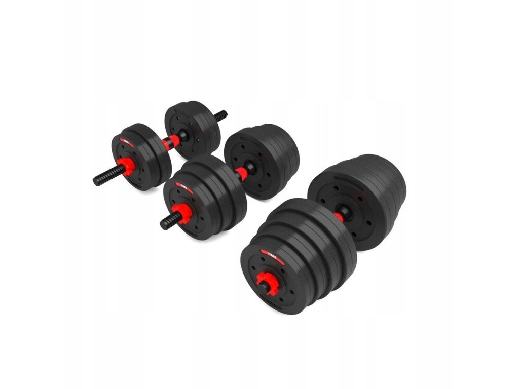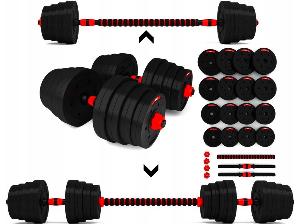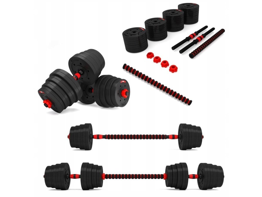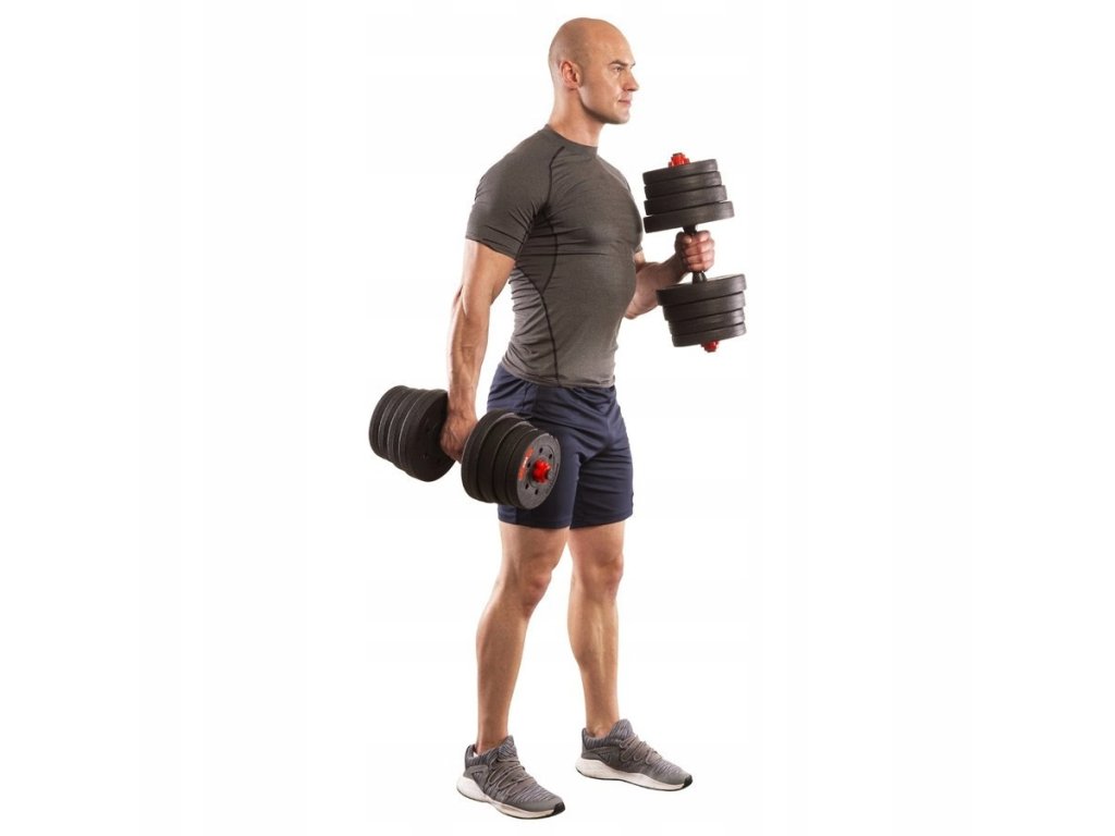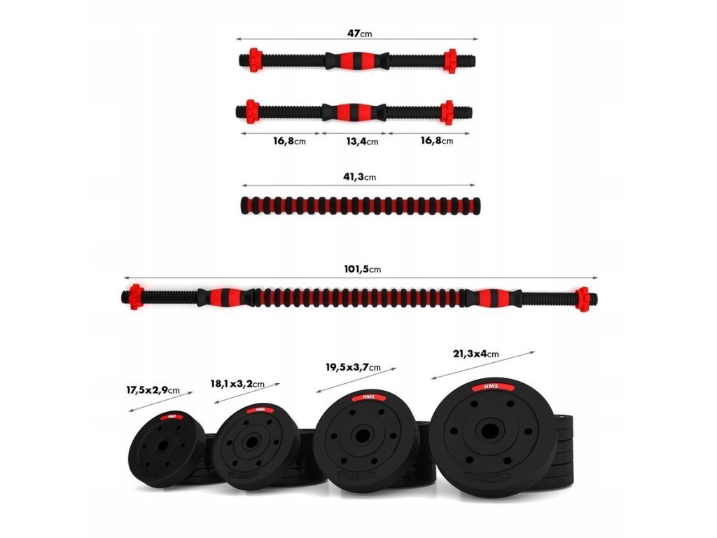 W skład zestawu wchodzą dwa gryfy, cztery zaciski, łączenie dwóch gryfów i łącznie 16 talerzy obciążeniowych.