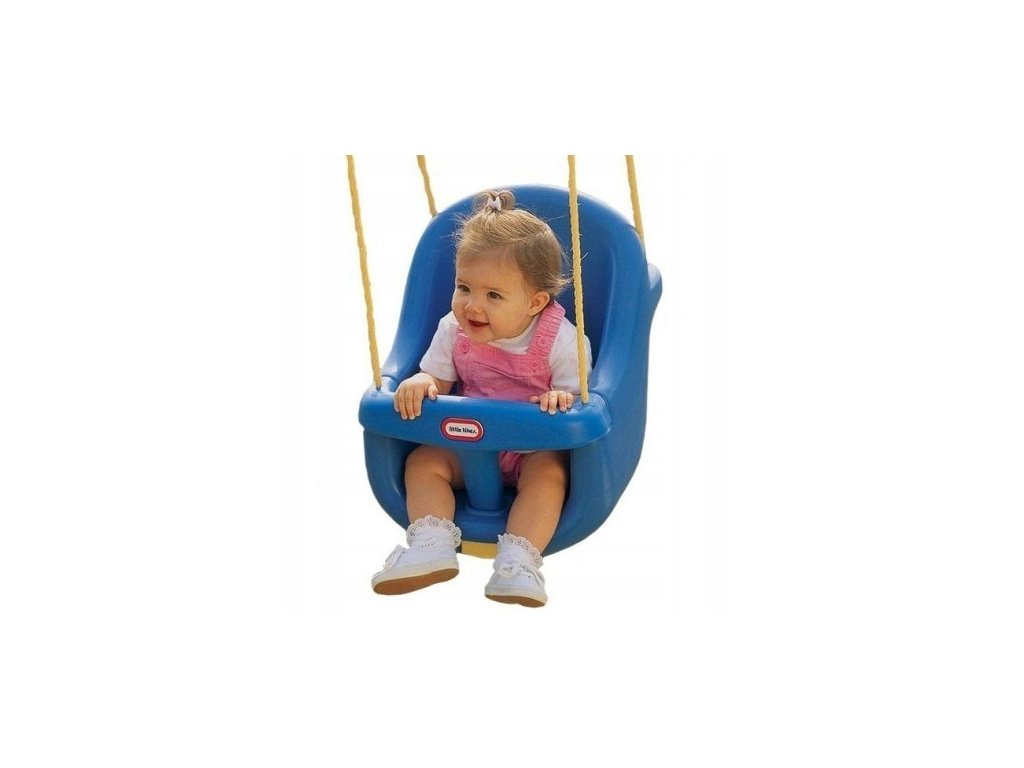 Huśtawka dla maluszka, w pełni bezpieczna, posiada regulowany pas, wysokie oparcie i ruchomą poprzeczkę, która pełni zamknięcia.