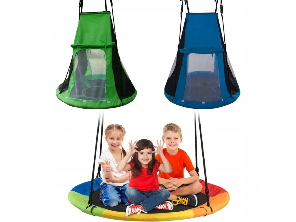 HUŚTAWKA OGRODOWA DZIECIĘCA BOCIANIE GNIAZDO KOLOROWA 110 cm +  NAMIOT- POKROWIEC Z MOSKITIERĄ 2 KOLORY: NIEBIESKI I ZIELONY