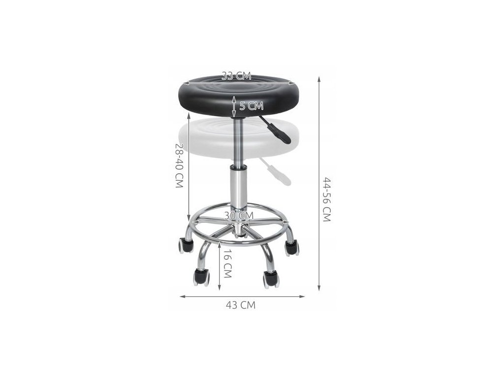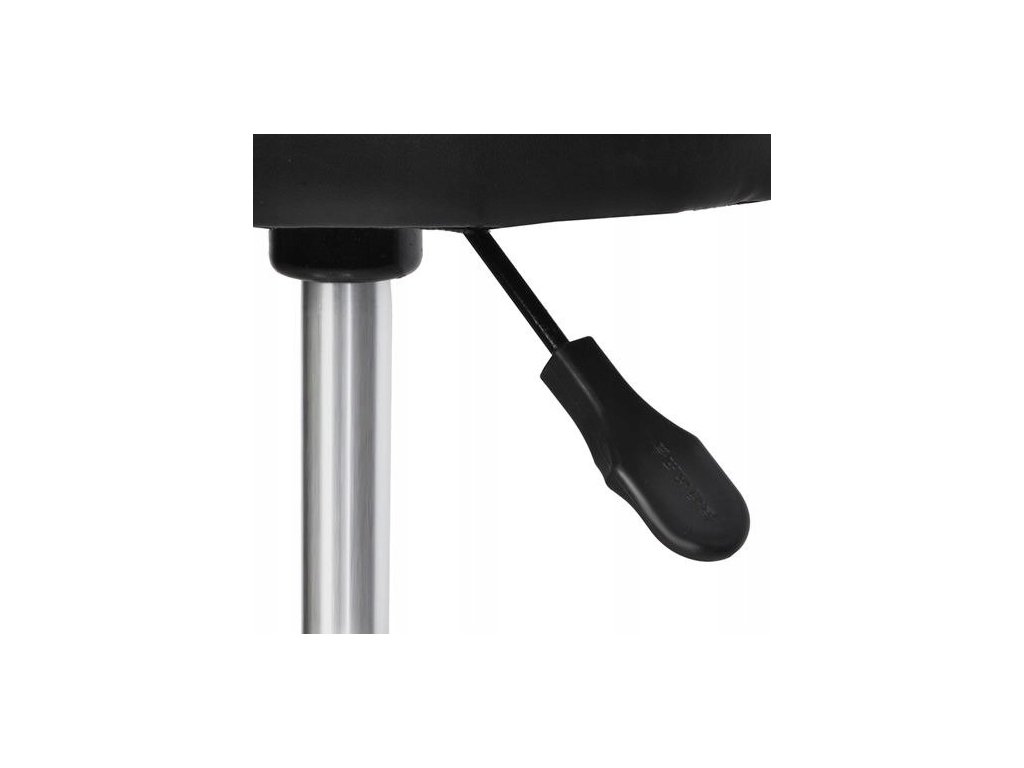 Stołek fryzjerski, kosmetyczny z pneumatyczną regulacją wysokości siedziska. Stabilna podstawa z pięcioma kółkami nierysującymi podłogi. Obrotowe, miękkie siedzisko. Metalowy podnóżek zapewnia wygodę. Stołek sprawdzi się w każdym salonie fryzjerskim i kosmetycznym, ale także w domu np. do kuchni lub w gabinecie, warsztacie itp.