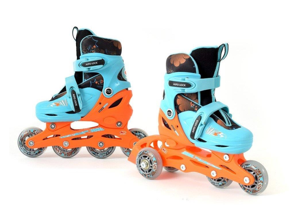 System regulacji buta umożliwia szybką zmianę w granicach czterech rozmiarów - jest to bardzo praktyczne wyjście, ponieważ wrotko-rolki rosną razem ze stopą dziecka. Regulacja rozmiarów jest zabezpieczona blokadą. Zamiana wrotek w rolki polega na przestawieniu kółek przy pomocy załączonego klucza według zawartej instrukcji.