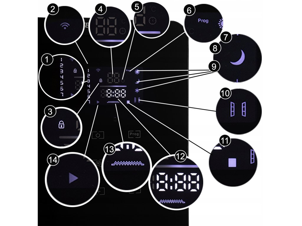Sterowanie WiFi | Pilot | Panel LED | Timer | Technologia X-shape | Regulacja | Zabezpieczenia | IP24 | Kółka | Szklany front | Stojący lub montowany na ścianie | Termostat | Programator tygodniowy | Blokada rodzicielska | Tryb ECO | Wykrywanie otwartego okna | Anty-zamarzanie |
