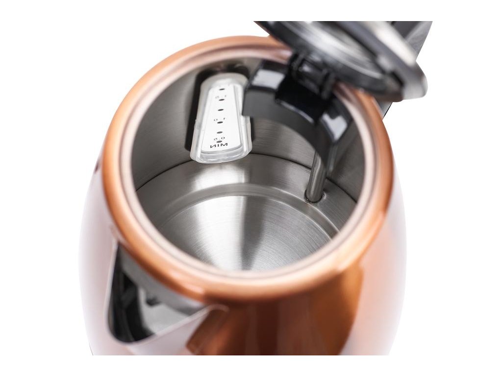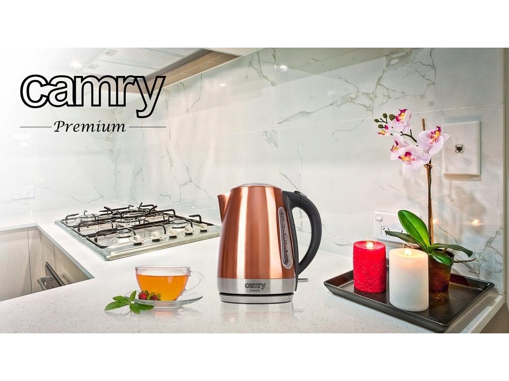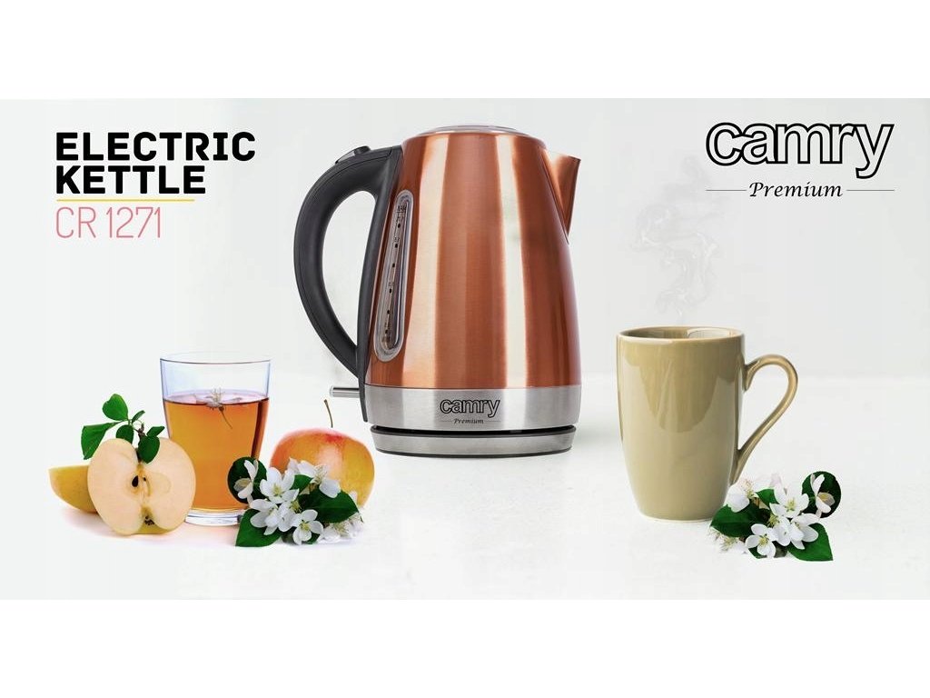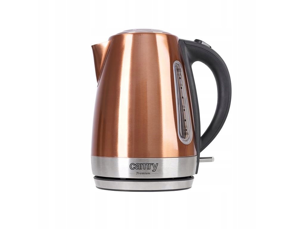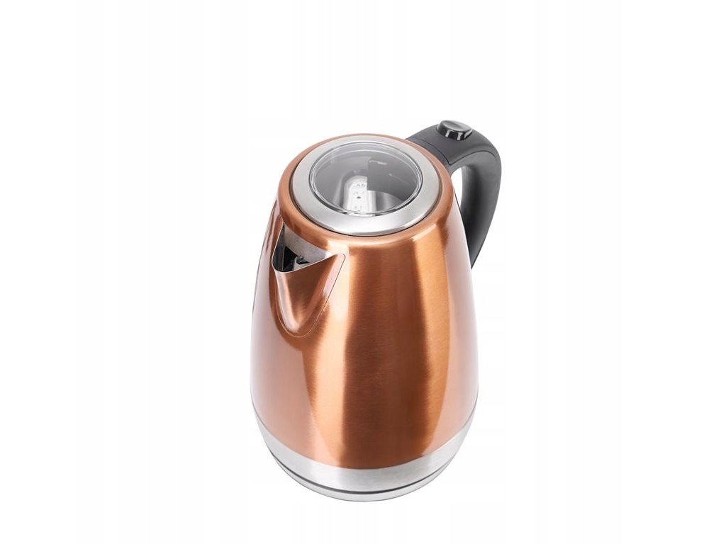 Elegancki miedziany kolor czajnika sprawia, że od razu wyróżnia się na kuchennym blacie. Duży czajnik rodzinny, pozwalający sprawnie zagotować wodę na herbatę dla 6-7 osób. Zaopatrzony w dwustronny wskaźnik poziomu wody, wygodny także dla leworęcznych użytkowników. Czajnik wyłączy się automatycznie po zagotowaniu wody. Blokada uniemożliwi również włączenie pustego czajnika, oszczędzając w ten sposób energię i dbając o bezpieczeństwo użytkownika. Wyjmowany filtr osadów zapewni odpowiednią jakość wody. Dla wygody został zaopatrzony w przycisk wspomagający otwieranie pokrywy, obrotową podstawę i płaską grzałkę. Czajnik wykonany jest ze stali szlachetnej i zaopatrzony w lampkę kontrolną LED. Charakteryzuje się elegancją i nowoczesną formą. W czajniku może naraz być podgrzewane aż 1,7 l wody.
