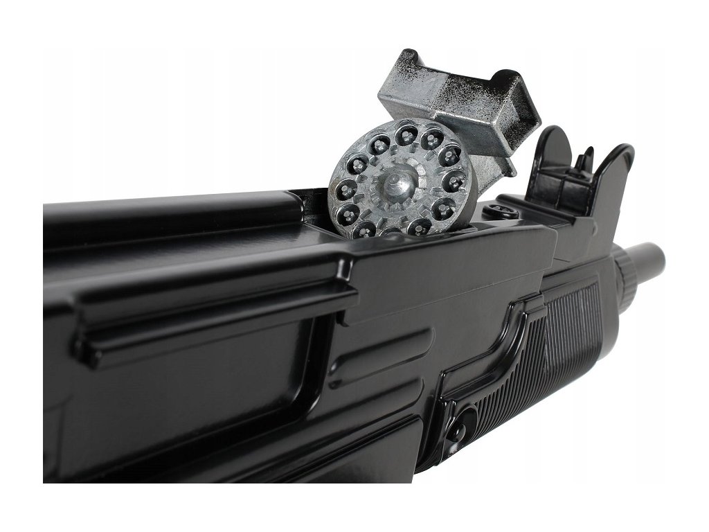 Metalowy pistolet maszynowy z otwieraną komorą na 12 naboi (kapiszonów).