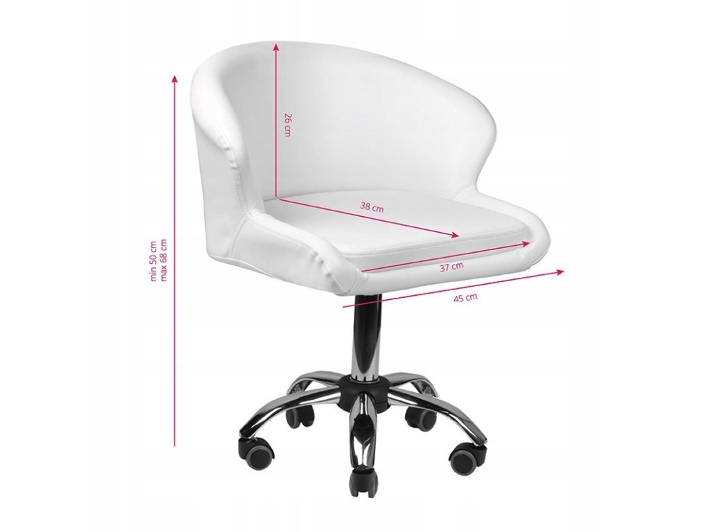 Nowoczesne krzesło kosmetyczne w kolorze białym. Bardzo wygodne siedzisko o nowoczesnym wygladzie. Wysokiej jakości ekoskóra jest gwarancją łatwiej pielęgnacji mebla. Fotel regulowany w płaszczyźnie góra-dół. Kółka gumowane.