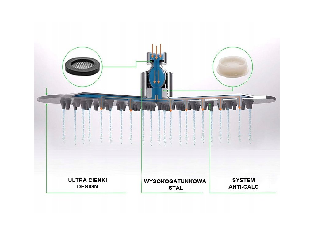 Dysze silikonowe w deszczownicy skutecznie zapobiegają osadzaniu się kamienia. Deszczownica ma funkcję regulacji możesz zmieniać jej kąt nachylenia w każdej płaszczyźnie