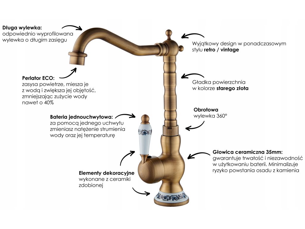 Mechaniczna bateria zlewozmywakowa, jednouchwytowa. Jest to bardzo praktyczne rozwiązanie do każdej kuchni. Korpus wykonany jest z mosiądzu, głowica ceramiczna. Posiada długą, obrotową wylewkę. Napowietrzająca końcówka - perlator - ogranicza zużycie wody nawet o 40%. W zestawie znajdują się dwa węże plecione (40 cm F 3/8") oraz wszystkie elementy potrzebne do montażu.