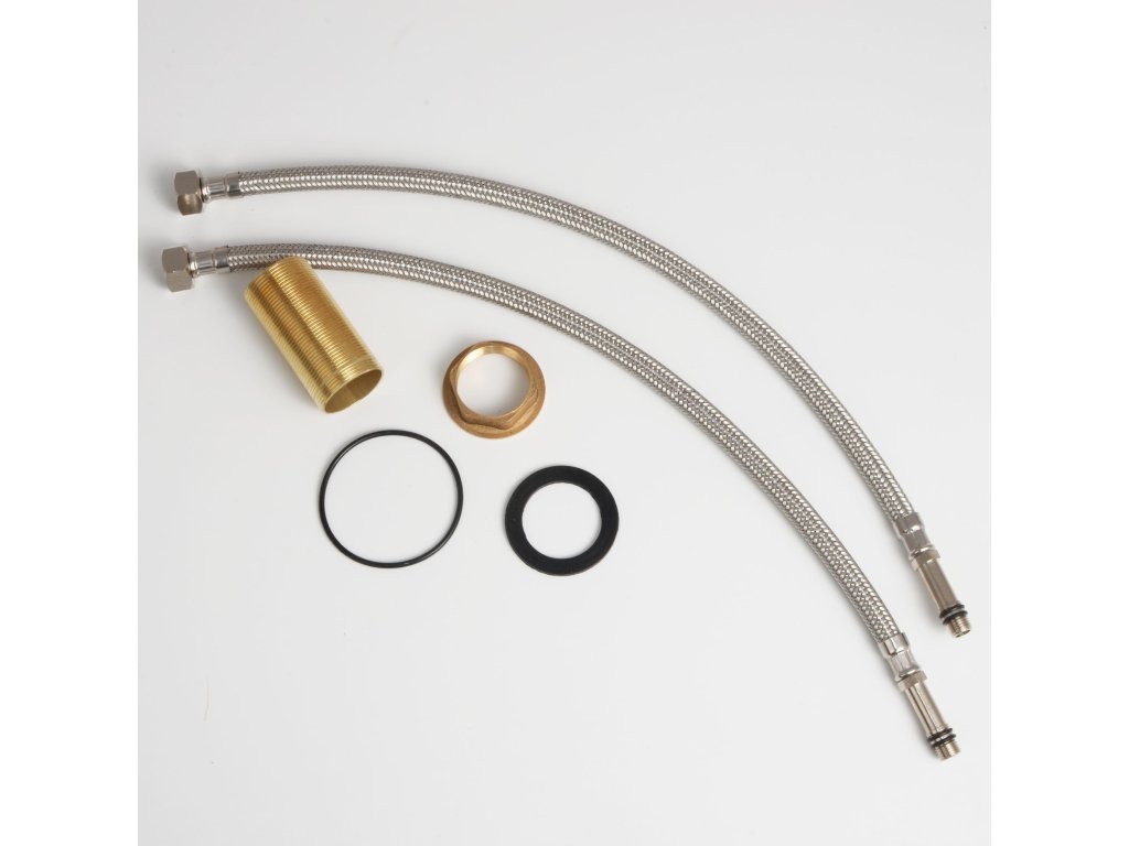 W zestawie znajdują się dwa wysokiej klasy wężyki w oplocie ze stali nierdzewnej do 10 barów ciśnienia (lepiej zabezpieczają przed zalaniem mieszkania niż np. często spotykane w bateriach wężyki w oplocie z aluminium).