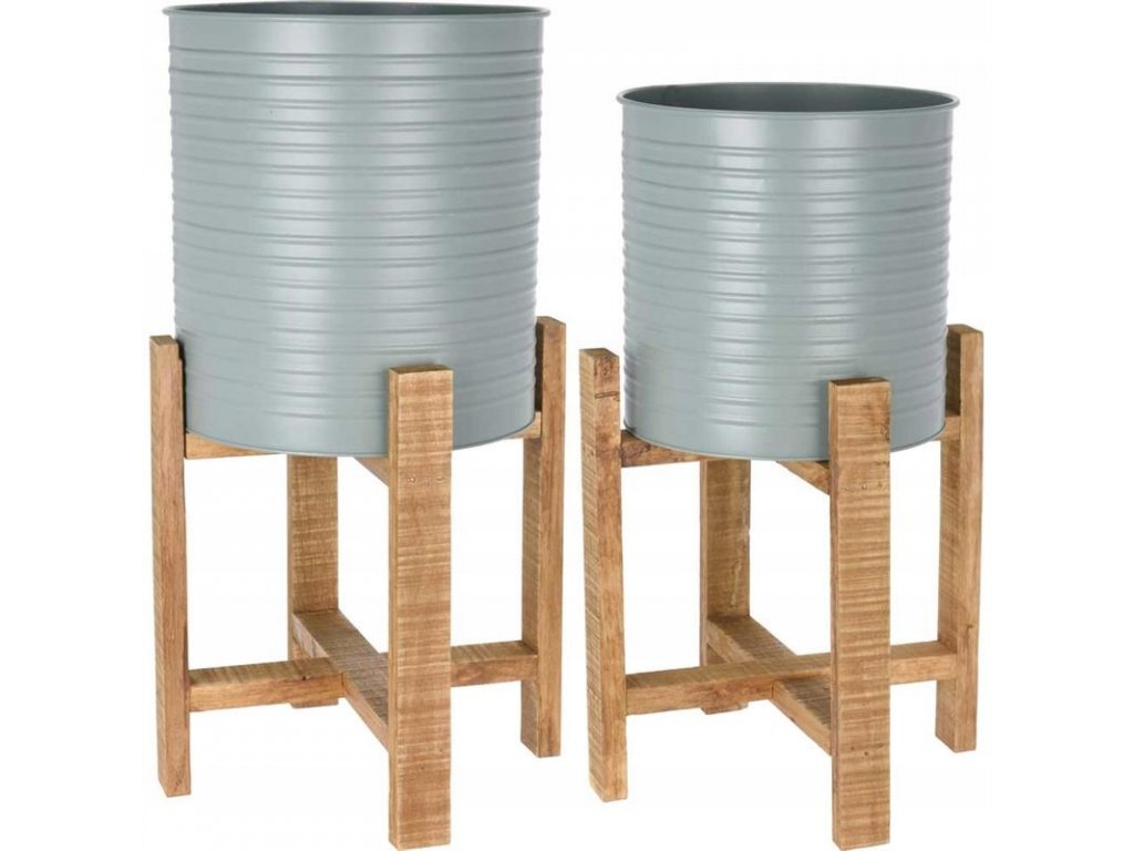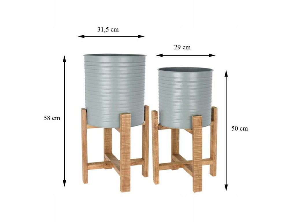 Metalowa doniczka umieszczona na drewnianym stojaku, komplet 2 szt. Idealnie sprawdzi się jako sposób na wyeksponowanie kwiatów. Tego rodzaju stojaki na kwiaty będą piękną dekoracją do wnętrz urządzonych w stylu skandynawskim. Donice nadają się także na zewnątrz do ogrodu lub na taras, balkon.