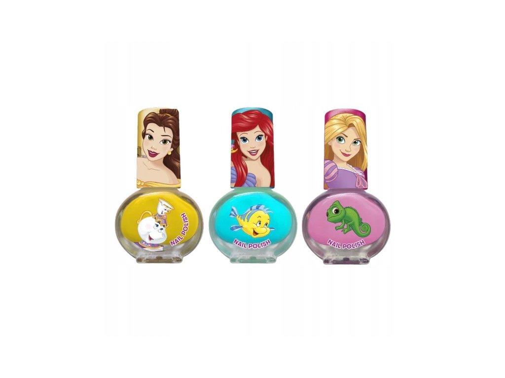 Sada na detskú manikúru, ktorá obsahuje 3 vodou riediteľné laky na nechty v ružovej, žltej a svetlomodrej farbe a tiež nálepky disney princeznej.