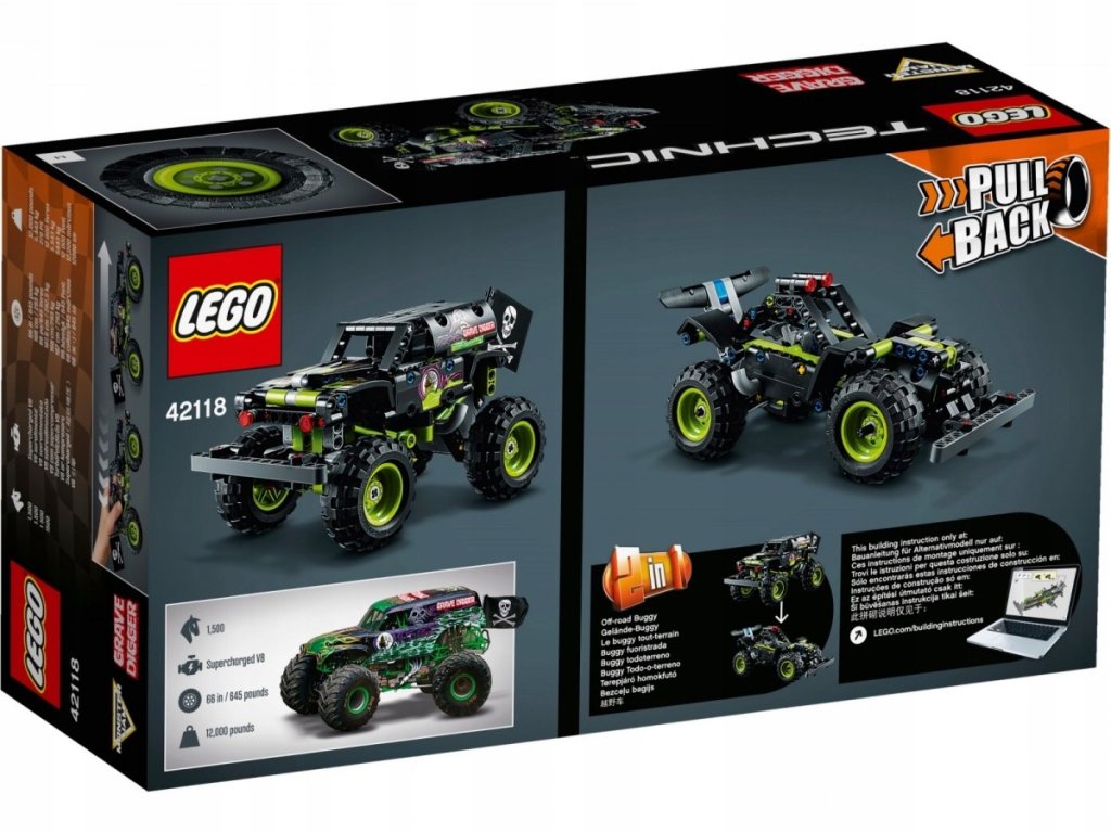 • Ciekawe wyzwanie dla młodych fanów motoryzacji model 2 w 1 pozwala zbudować monster trucka Monster Jam Grave Digger lub łazik terenowy.