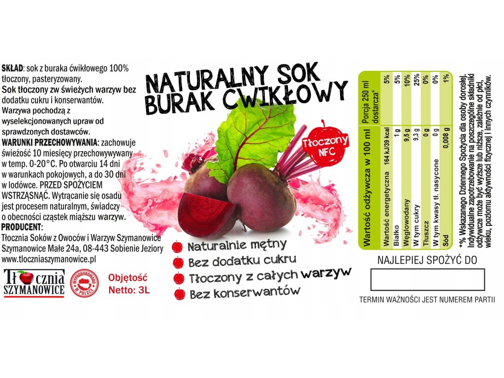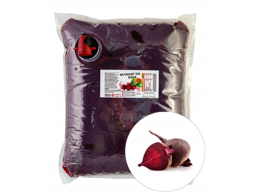 Produktem na aukcji jest SOK BURAK 100%. Sok w worku o pojemności 3000 ml z kranikiem do wygodnego nalewania.