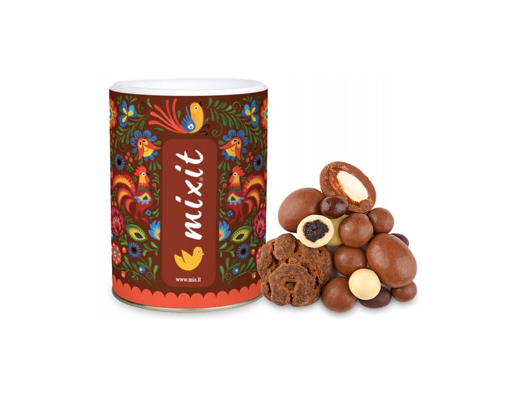 Składniki: Mieszanka orzechów włoskich w gorzkiej czekoladzie z cynamonem (20%), prażonych migdałów w mlecznej czekoladzie ( 20%) czarnej porzeczki w mlecznej czekoladzie (18%), aronii w białej czekoladzie (18%), orzechów laskowych w mlecznej czekoladzie (14%) i ziaren kawy w gorzkiej czekoladzie (10%) (mleczna czekolada 41%, ( cukier, masło kakaowe, masa kakaowa, mleko tłuste w proszku, masa kakaowa, emulgator: lecytyna, naturalny waniliowy aromat), gorzka czekolada 24% (cukier, masa kakaowa, masło kakaowe, emulgator: lecytyna, naturalny waniliowy aromat) biała czekolada 12% (cukier, kakaowe masło, mleko tłuste w proszku, śmietanka w proszku, emulgator: lecytyna, naturalny waniliowy aromat), aronia kandyzowana 5,8% (cukier, aronia, dekstroza, regulator kwasowości: kwas cytrynowy), orzechy włoskie 4,2%, prażone orzechy laskowe, 4,1%, migdały prażone 4%, czarna porzeczka suszona mrozem 2,5%, prażone ziarna kawy 1%, cynamon w proszku 0,8%, substancje polerujące (guma arabska; cukier, miód). Zawartość suchej masy kakaowej w czekoladzie mlecznej wynosi nie mniej niż 30%. Zawartość suchej masy kakaowej w czekoladzie gorzkiej wynosi nie mniej niż 49%